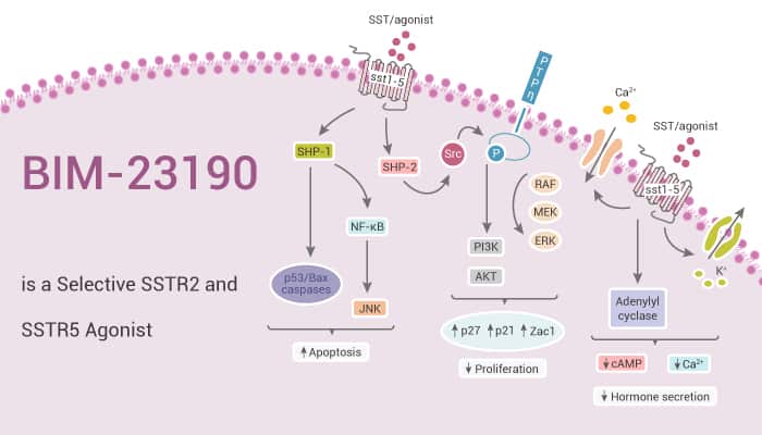 First of all, BIM-23190, a somatostatin analog, exhibits Ki values of 0.34 nM and 11.1 nM for SSTR2 and SSTR5, respectively. Nonetheless, BIM-23190 has the potential for the study for cancer and acromegaly.