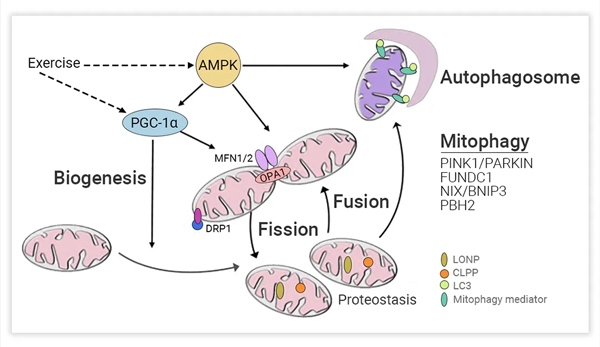 Typically, after a period of operation, mitochondrial function begins to decline, prompting fusion between mitochondria to share a common internal system, thereby sustaining normal mitochondrial function. Soon after, if mitochondrial function continues to degrade, the mitochondria will start to undergo fission to eliminate damaged ones. Healthy mitochondria will continue to fuse, while the eliminated ones will be degraded and recycled through autophagy. Mitochondrial fission, fusion, and autophagy are all aimed at enhancing the mitochondria's ability to perform their tasks: mitochondrial biogenesis (Figure 1).