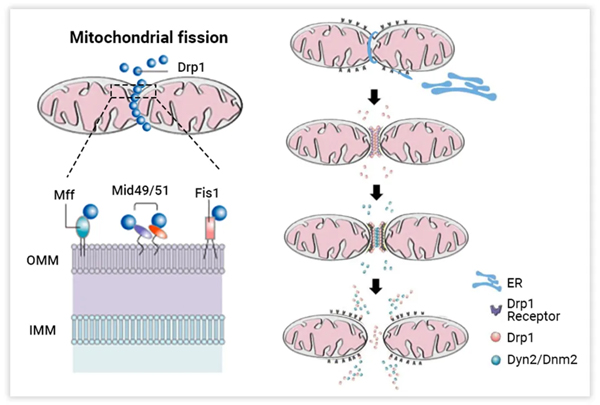 Figure 3. Regulatory mechanism of mitochondrial division (left) and schematic diagram (right)[4][5].