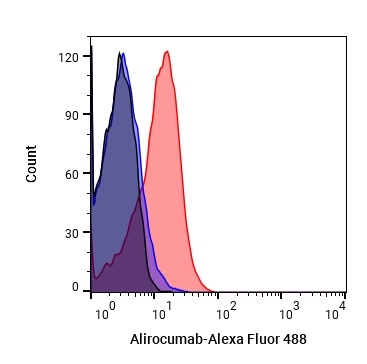 • Flow Cytometry analysis of Hela cells labelling PCSK9 (red) with Alirocumab (anti-PCSK9) (HY-P9928A). Goat Anti-Human IgG (Alexa Fluor 488) (HY-P83776) at a dilution of 1/1000 was used as the secondary antibody. Blue-Human IgG1 kappa (HY-P99001). Black-Unlabelled control, cells without incubation with primary antibody.