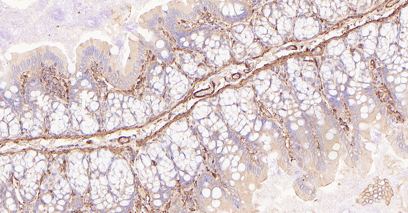 • Immunohistochemical analysis of paraffin-embedded Rat colon tissue using alpha smooth muscle Actin Antibody. The section was pre-treated using heat mediated antigen retrieval with Tris-EDTA buffer (pH 8.0) for 8 minutes. The tissues were blocked in QuickBlock for 20 minutes at room temperature, washed with ddH2O and PBS, and then probed with the primary antibody (HY-P80484, 1/200) in 4℃ overnight. The detection was performed using an HRP conjugated compact polymer system. DAB was used as the chromogen. Tissues were counterstained with hematoxylin and mounted with DPX.