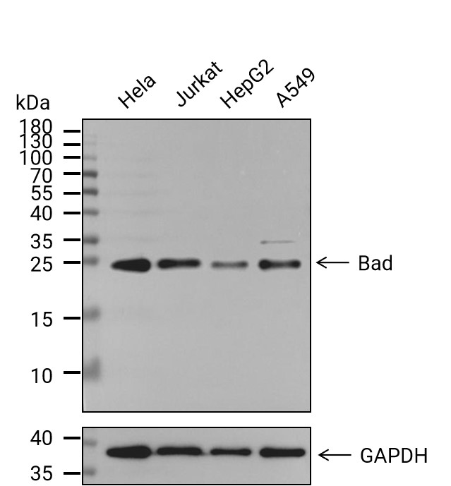 • Western blot analysis of extracts from Hela(lane 1(20μg)) 、Jurkat(lane 2(20μg)) 、HepG2(lane 3(20μg))and A549(lane 4(20μg) using Bad Antibody(HY-P80025). Proteins were transferred to a PVDF membrane and blocked with 5%BSA in TBST for 1.5 hour at room temperature. The primary antibody ( 1/500) and Loading control antibody (GAPDH, 1/1000) was used in 5% BSA in TBST at 4℃ overnight. Goat Anti-Rabbit IgG-HRP Secondary Antibody (1/10,000) was used for 1 hour at room temperature.