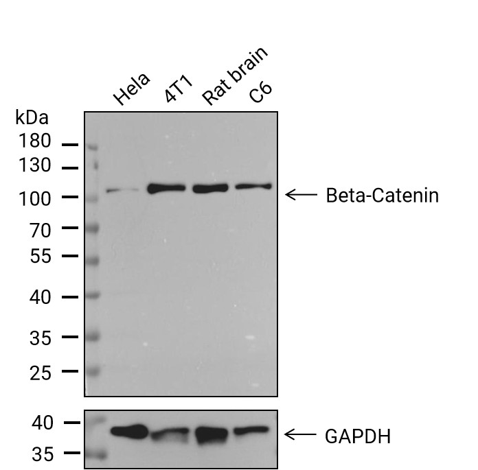 • Western blot analysis of extracts from Hela(lane 1(20μg)) 、4T1(lane 2(20μg)) 、Rat brain(lane 3(20μg))and C6​(lane 4(20μg) using Beta-Catenin Antibody(HY-P80488). Proteins were transferred to a PVDF membrane and blocked with 5%BSA in TBST for 1.5 hour at room temperature. The primary antibody ( 1/1000) and Loading control antibody (GAPDH, 1/1000) was used in 5% BSA in TBST at 4℃ overnight. Goat Anti-Rabbit IgG-HRP Secondary Antibody (1/10,000) was used for 1 hour at room temperature.
