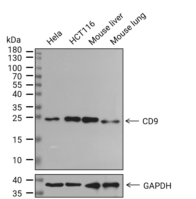• Western blot analysis of extracts from Hela(lane 1(20μg)) 、HCT116(lane 2(20μg)) 、​Mouse liver(lane 3(20μg))and Mouse lung(lane 4(20μg) using CD9 Antibody(HY-P80068). Proteins were transferred to a PVDF membrane and blocked with 5%BSA in TBST for 1.5 hour at room temperature. The primary antibody ( 1/500) and Loading control antibody (GAPDH, 1/1000) was used in 5% BSA in TBST at 4℃ overnight. Goat Anti-Rabbit IgG-HRP Secondary Antibody (1/10,000) was used for 1 hour at room temperature.