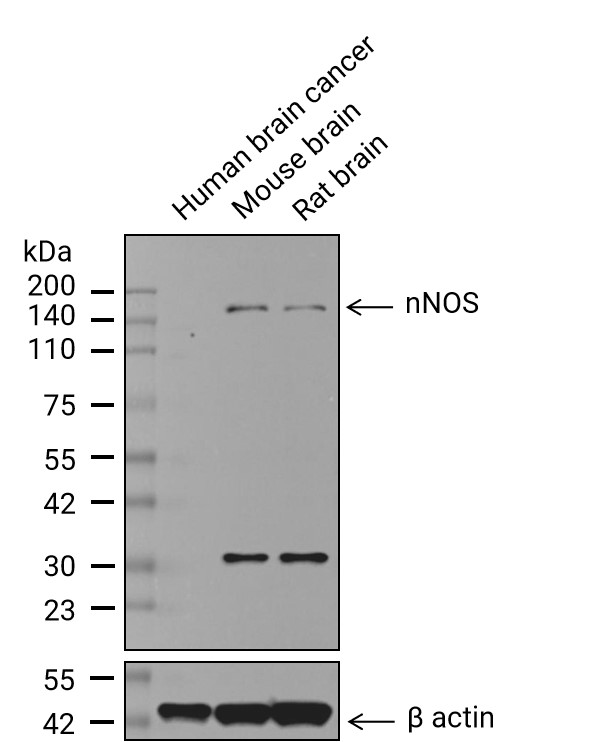 • Western blot analysis of extracts from ​Human brain cancer(lane 1(20μg)) 、Mouse brain(lane 2(20μg)) 、Rat brain(lane 3(20μg))and Rat brain(lane 4(20μg) using nNOS Antibody(HY-P80249). Proteins were transferred to a PVDF membrane and blocked with 5%BSA in TBST for 1.5 hour at room temperature. The primary antibody ( 1/1000) and Loading control antibody (β actin, 1/1000) was used in 5% BSA in TBST at 4℃ overnight. Goat Anti-Rabbit IgG-HRP Secondary Antibody (1/10,000) was used for 1 hour at room temperature.