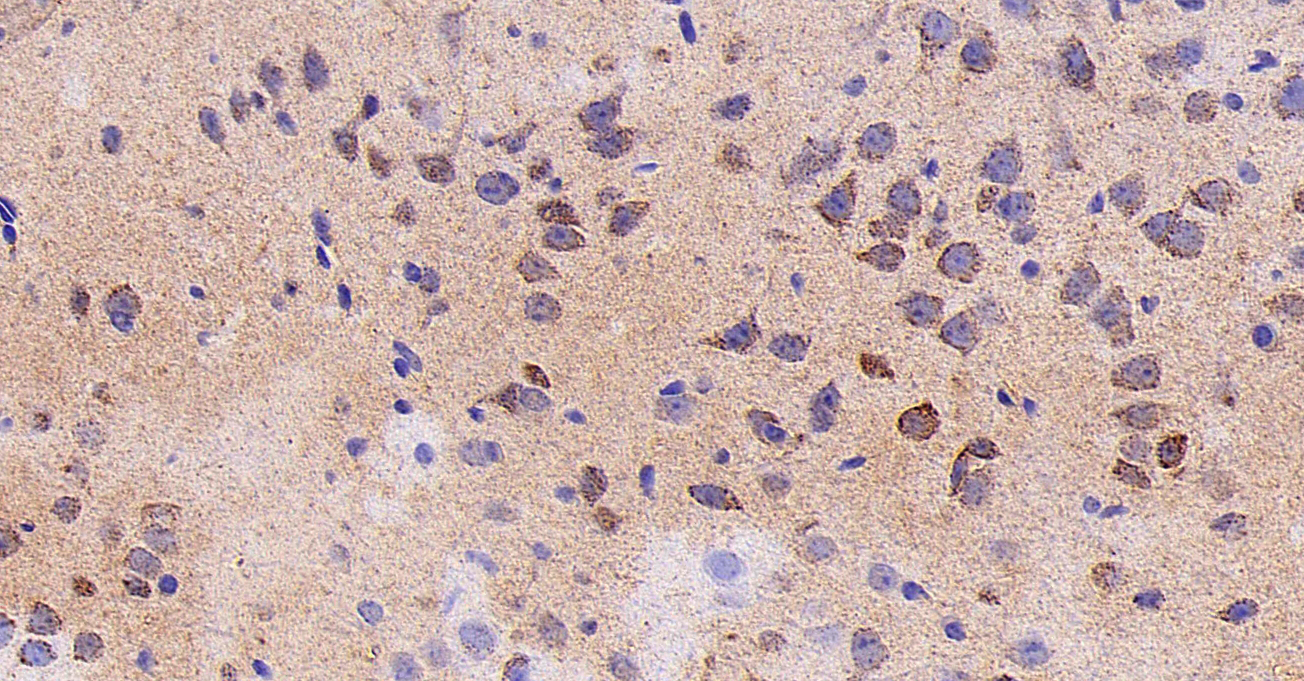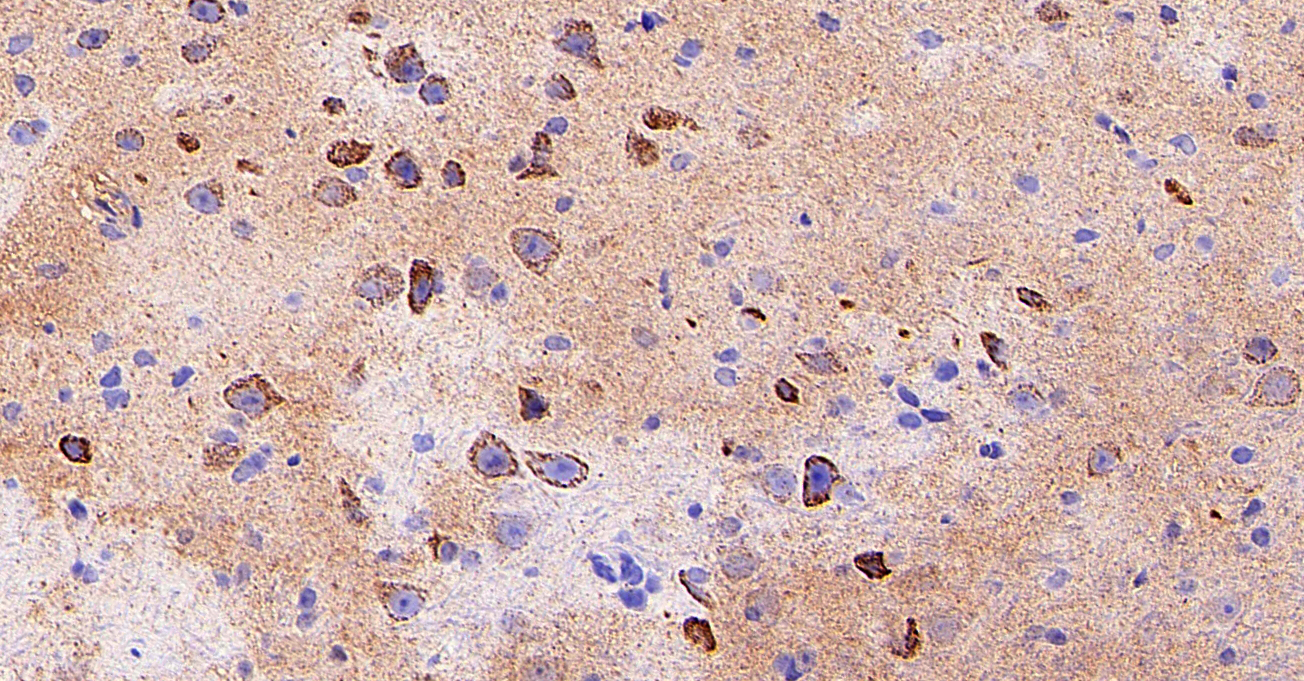 • Immunohistochemical analysis of paraffin-embedded Mouse brain tissue using Pyruvate Dehydrogenase E1 beta subunit Antibody. The section was pre-treated using heat mediated antigen retrieval with Tris-EDTA buffer (pH 9.0) for 8 minutes. The tissues were blocked in QuickBlock for 20 minutes at room temperature, washed with ddH2O and PBS, and then probed with the primary antibody (HY-P80291, 1/500) in 4℃ overnight. The detection was performed using an HRP conjugated compact polymer system. DAB was used as the chromogen. Tissues were counterstained with hematoxylin and mounted with DPX.