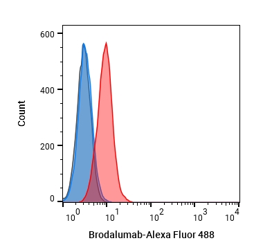• Flow cytometric analysis of 1X106 K562 cells with Brodalumab (HY-P9925, red). Cells were fixed with 4% paraformaldehyde. Then stained with the primary antibody at 1/200 dilution for an hour at 4℃. Alexa Fluor 488-conjugated AffiniPure Goat Anti-Human IgG H&L (HY-P83776) was used as the secondary antibody at 1/1,000 dilution for 30 minutes at 4℃. Human IgG2 kappa (HY-P99002, blue) was used as the isotype control, cells without incubation with primary antibody were used as the unlabeled control (black).