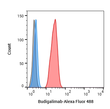 • Flow cytometric analysis of 1X106 10 ng/mL PMA and 1 μg/mL Ionomycin co-stimulated Jurkat cells(24h) with Budigalimab (HY-P99489, red). Cells were fixed with 4% paraformaldehyde. Then stained with the primary antibody at 1/200 dilution for an hour at 4℃. Alexa Fluor 488-conjugated AffiniPure Goat Anti-Human IgG H&L (HY-P83776) was used as the secondary antibody at 1/1,000 dilution for 30 minutes at 4℃. Human IgG1 kappa (HY-P99001, blue) was used as the isotype control, cells without incubation with primary antibody were used as the unlabeled control (black).