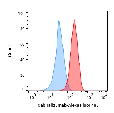 • Flow cytometric analysis of 1.5X106 THP-1 cells labeling Cabiralizumab (HY-P99259, red). Cells were fixed with 4% paraformaldehyde. Then stained with the primary antibody at 1/200 dilution for an hour at 4℃. Goat Anti-Human IgG H&L (AF488) (HY-P83776) was used as the secondary antibody at 1/1,000 dilution for 30 minutes at 4℃. Human IgG4 kappa (HY-P99003, blue) was used as the isotype control.
