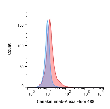 • Flow cytometric analysis of 1.5X106 RAW264.7 cells treated with 50 nM phorbol-12-myristate-13-acetate (PMA, HY-18739) and 5 μg/ml lipopolysaccharide (LPS, HY-D1056) for 24 hours with Canakinumab (HY-108810, red). Cells were fixed with 4% paraformaldehyde. Then stained with the primary antibody at 1/200 dilution for an hour at 4℃. Goat Anti-Human IgG H&L (AF488) (HY-P83776) was used as the secondary antibody at 1/1,000 dilution for 30 minutes at 4℃, Human IgG1 kappa, Isotype Control (HY-P99001, blue) was used as the isotype control.