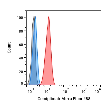 • Flow cytometric analysis of 1X106 10 ng/mL PMA and 1 μg/mL Ionomycin co-stimulated Jurkat cells (24h) labeling Cemiplimab (HY-P99203, red). Cells were fixed with 4% paraformaldehyde. Then stained with the primary antibody at 1/200 dilution for an hour at 4℃. Alexa Fluor 488-conjugated AffiniPure Goat Anti-Human IgG H&L (HY-P83776) was used as the secondary antibody at 1/1,000 dilution for 30 minutes at 4℃. Human IgG4 kappa (HY-P99003, blue) was used as the isotype control, cells without incubation with primary antibody were used as the unlabeled control (black).