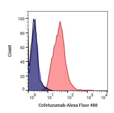 • Flow Cytometry analysis of Hela cells labelling PTK7/CCK4 (red) with Cofetuzumab (anti-PTK7/CCK4) (HY-P99828). Goat Anti-Human IgG (Alexa Fluor 488) (HY-P83776) at a dilution of 1/1000 was used as the secondary antibody. Blue-Human IgG1 kappa (HY-P99001). Black-Unlabelled control, cells without incubation with primary antibody.