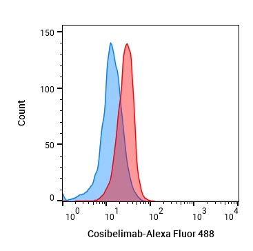 • Flow cytometric analysis of 106 Jurkat cells with Cosibelimab (HY-P99833, red). Cells were fixed with 4% paraformaldehyde. Then stained with the primary antibody at 1/200 dilution for an hour at 4℃. Alexa Fluor® 488-conjugated AffiniPure Goat Anti-Human IgG H&L (HY-P83776) was used as the secondary antibody at 1/1,000 dilution for 30 minutes at 4℃. Human IgG1 lambda1 (HY-P99992, blue) was used as the isotype control.