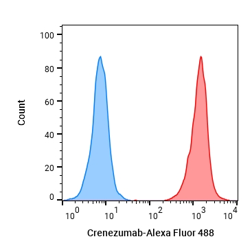 • Flow cytometric analysis of 1.5×106 HUVEC cells with Crenezumab (HY-P99835, red). Cells were fixed with 4% paraformaldehyde and permeabilised with 90% methanol. Then stained with the primary antibody at 1/200 dilution for an hour at 4℃. Goat Anti-Human IgG H&L (AF488) (HY-P83776) was used as the secondary antibody at 1/1,000 dilution for 30 minutes at 4℃. Human IgG1 kappa, Isotype Control (HY-P99001, blue) was used as the isotype control.