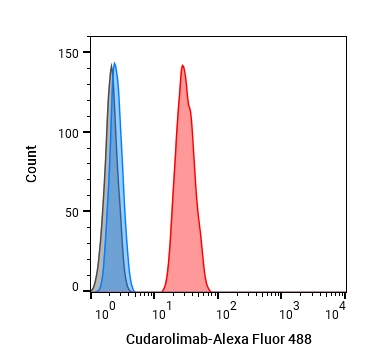 • Flow cytometric analysis of 1X106 500 ng/mL anti-CD3 and 500 ng/mL ant-CD28 co-stimulated Jurkat cells(24h) with Cudarolimab (HY-P99836, red). Cells were fixed with 4% paraformaldehyde. Then stained with the primary antibody at 1/200 dilution for an hour at 4℃. Alexa Fluor 488-conjugated AffiniPure Goat Anti-Human IgG H&L (HY-P83776) was used as the secondary antibody at 1/1,000 dilution for 30 minutes at 4℃. Human IgG1 kappa (HY-P99001, blue) was used as the isotype control, cells without incubation with primary antibody were used as the unlabeled control (black).