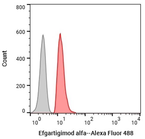 • Flow cytometric analysis of 1X106 THP-1 cells with Efgartigimod alfa (HY-147305, red). Cells were fixed with 4% paraformaldehyde. Then stained with the primary antibody at 1/200 dilution for an hour at 4℃. Alexa Fluor 488-conjugated AffiniPure Goat Anti-Human IgG H&L (AF488) (HY-P83776) was used as the secondary antibody at 1/1,000 dilution for 30 minutes at 4℃. cells without incubation with primary antibody were used as the unlabeled control (black).