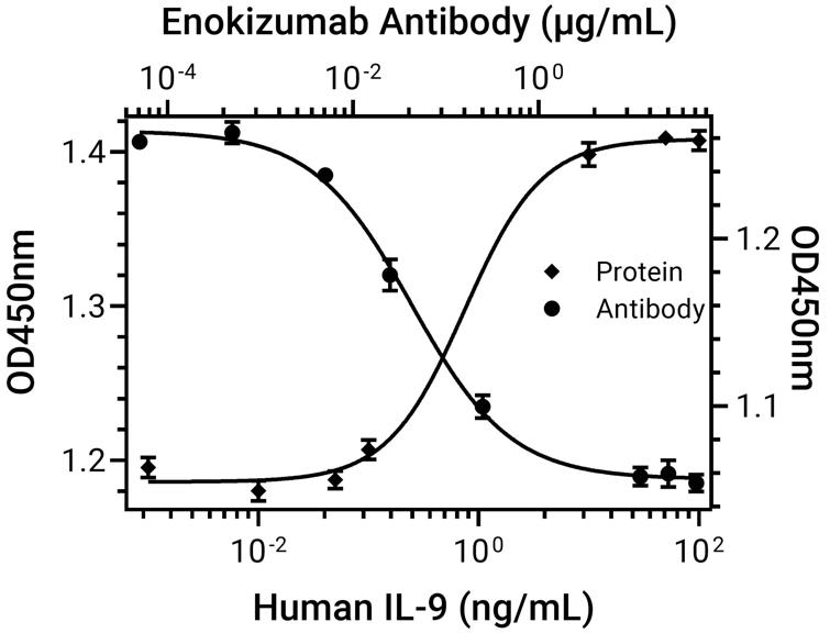 • Enokizumab (HY-P99193) neutralizes Recombinant Human IL-9 (HY-P7046) induced proliferation in the Mo7e cell line. The Neutralization Dose (ND50) for this effect is 0.043 μg/mL in the presence of 5 ng/mL Recombinant Human IL-9.