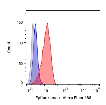 • Flow cytometric analysis of 1X106 A549 cells with Eptinezumab (HY-P99017, red). Cells were fixed with 4% paraformaldehyde. Then stained with the primary antibody at 1/200 dilution for an hour at 4℃. Alexa Fluor 488-conjugated AffiniPure Goat Anti-Human IgG H&L (AF488) (HY-P83776) was used as the secondary antibody at 1/1,000 dilution for 30 minutes at 4℃. Human IgG1 kappa (HY-P99001, blue) was used as the isotype control, cells without incubation with primary antibody were used as the unlabeled control (black).