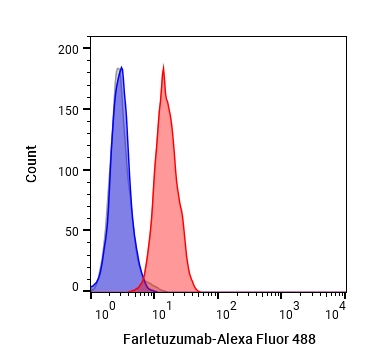 • Flow cytometric analysis of 1X106 MCF-7 cells with Farletuzumab (HY-P99153, red). Cells were fixed with 4% paraformaldehyde. Then stained with the primary antibody at 1/200 dilution for an hour at 4℃. Alexa Fluor 488-conjugated AffiniPure Goat Anti-Human IgG H&L (AF488) (HY-P83776) was used as the secondary antibody at 1/1,000 dilution for 30 minutes at 4℃. Human IgG1(D356E/L358M) kappa (HY-P990100, blue) was used as the isotype control, cells without incubation with primary antibody were used as the unlabeled control (black).