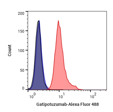 • Flow Cytometry analysis of Hela cells labelling MUC1 (red) with Gatipotuzumabt (anti-MUC1) (HY-P99634). Goat Anti-Human IgG (Alexa Fluor 488) (HY-P83776) at a dilution of 1/1000 was used as the secondary antibody. Blue-Human IgG1 kappa (HY-P99001). Black-Unlabelled control, cells without incubation with primary antibody.
