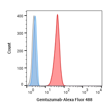• Flow cytometric analysis of 1.5X106 THP-1 cells with Gemtuzumab (HY-P99971, red). Cells were fixed with 4% paraformaldehyde. Then stained with the primary antibody at 1/200 dilution for an hour at 4℃. Goat Anti-Human IgG H&L (AF488) (HY-P83776) was used as the secondary antibody at 1/1,000 dilution for 30 minutes at 4℃. Human IgG4 (S228P) kappa, Isotype Control (HY-P99003, blue) was used as the isotype control, cells without incubation with primary antibody were used as the unlabeled control (black).