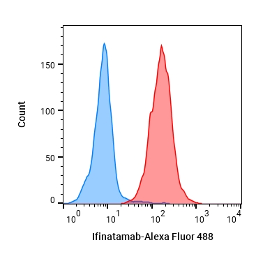 • Flow cytometric analysis of 1.5X106 THP-1 cells with Ifinatamab (HY-P99367, red). Cells were fixed with 4% paraformaldehyde. Then stained with the primary antibody at 1/200 dilution for an hour at 4℃. Goat Anti-Human IgG H&L (AF488) (HY-P83776) was used as the secondary antibody at 1/1,000 dilution for 30 minutes at 4℃. Human IgG1 kappa (HY-P99001, blue) was used as the isotype control.