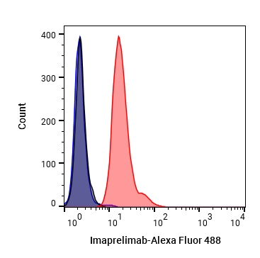 • Flow Cytometry analysis of Hela cells labelling MUC18/MCAM/CD146 (red) with Imaprelimab (anti-MUC18/MCAM/CD146) (HY-P99658). Goat Anti-Human IgG (Alexa Fluor 488) (HY-P83776) at a dilution of 1/1000 was used as the secondary antibody. Blue-Human IgG1 kappa (HY-P99001). Black-Unlabelled control, cells without incubation with primary antibody.