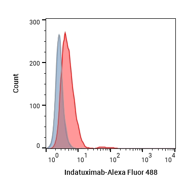 • Flow cytometric analysis of 1.5X106 HEPG2 cells with Indatuximab (HY-P990607, red). Cells were fixed with 4% paraformaldehyde. Then stained with the primary antibody at 1/200 dilution for an hour at 4℃. Goat Anti-Human IgG H&L (AF488) (HY-P83776) was used as the secondary antibody at 1/1,000 dilution for 30 minutes at 4℃. Human IgG4 (S228P) kappa, Isotype Control (HY-P99003, blue) was used as the isotype control, cells without incubation with primary antibody were used as the unlabeled control (black).