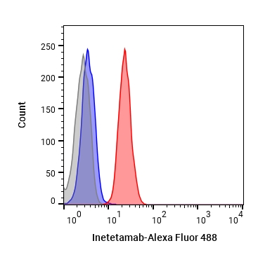 • Flow cytometric analysis of 1X106 MCF-7 cells with Inetetamab (HY-P99969, red). Cells were fixed with 4% paraformaldehyde. Then stained with the primary antibody at 1/200 dilution for an hour at 4℃. Alexa Fluor 488-conjugated AffiniPure Goat Anti-Human IgG H&L (AF488) (HY-P83776) was used as the secondary antibody at 1/1,000 dilution for 30 minutes at 4℃. Human IgG1 kappa (HY-P99001, blue) was used as the isotype control, cells without incubation with primary antibody were used as the unlabeled control (black).