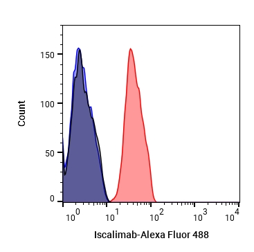• Flow Cytometry analysis of Raji cells labelling TNFRSF5/CD40 (red) with Iscalimab (anti-TNFRSF5/CD40) (HY-P99670). Goat Anti-Human IgG (Alexa Fluor 488) (HY-P83776) at a dilution of 1/1000 was used as the secondary antibody. Blue-Human IgG1 kappa (HY-P99001). Black-Unlabelled control, cells without incubation with primary antibody.
