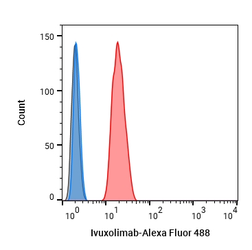 • Flow cytometric analysis of 1X106 500 ng/mL anti-CD3 and 500 ng/mL ant-CD28 co-stimulated Jurkat cells(24h) with Ivuxolimab (HY-P99159, red). Cells were fixed with 4% paraformaldehyde. Then stained with the primary antibody at 1/200 dilution for an hour at 4℃. Alexa Fluor 488-conjugated AffiniPure Goat Anti-Human IgG H&L (HY-P83776) was used as the secondary antibody at 1/1,000 dilution for 30 minutes at 4℃. Human IgG2 kappa (HY-P99002, blue) was used as the isotype control, cells without incubation with primary antibody were used as the unlabeled control (black).