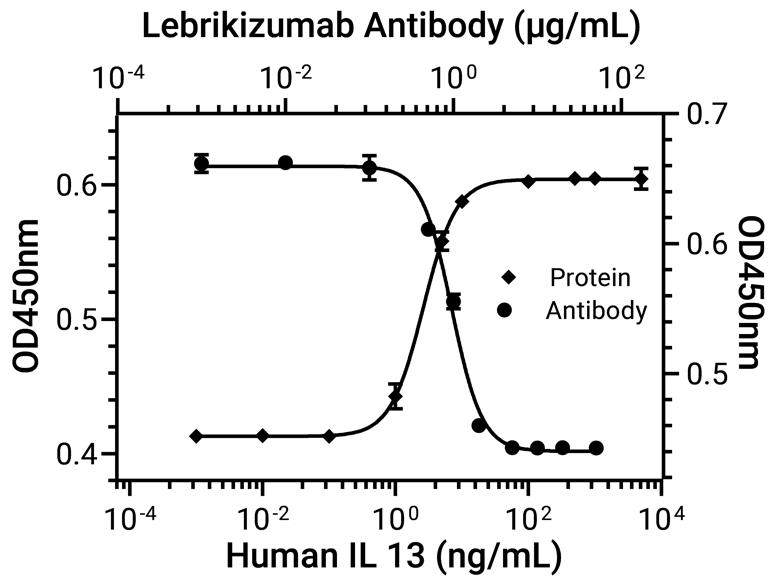 Lebrikizumab (TNX-650) is an IgG4 humanized anti-interleukin-13 (IL-13) mAb with anti-itch effects that specifically binds to IL-13 in a non-receptor binding domain and inhibits its function. Lebrikizumab inhibits the IL-13 driven Th2 inflammatory response and blocks the signaling of IL-4Rα/IL-13Rα1. Lebrikizumab can be used for the research of asthma, atopic dermatitis and neuroinflammatory diseases.