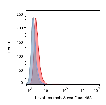 • Flow cytometric analysis of 1.5X106 HEPG2 cells with Lexatumumab (HY-P99299, red). Cells were fixed with 4% paraformaldehyde. Then stained with the primary antibody at 1/200 dilution for an hour at 4℃. Goat Anti-Human IgG H&L (AF488) (HY-P83776) was used as the secondary antibody at 1/1,000 dilution for 30 minutes at 4℃. Human IgG1 lambda2, Isotype Control (HY-P990096, blue) was used as the isotype control, cells without incubation with primary antibody were used as the unlabeled control (black).