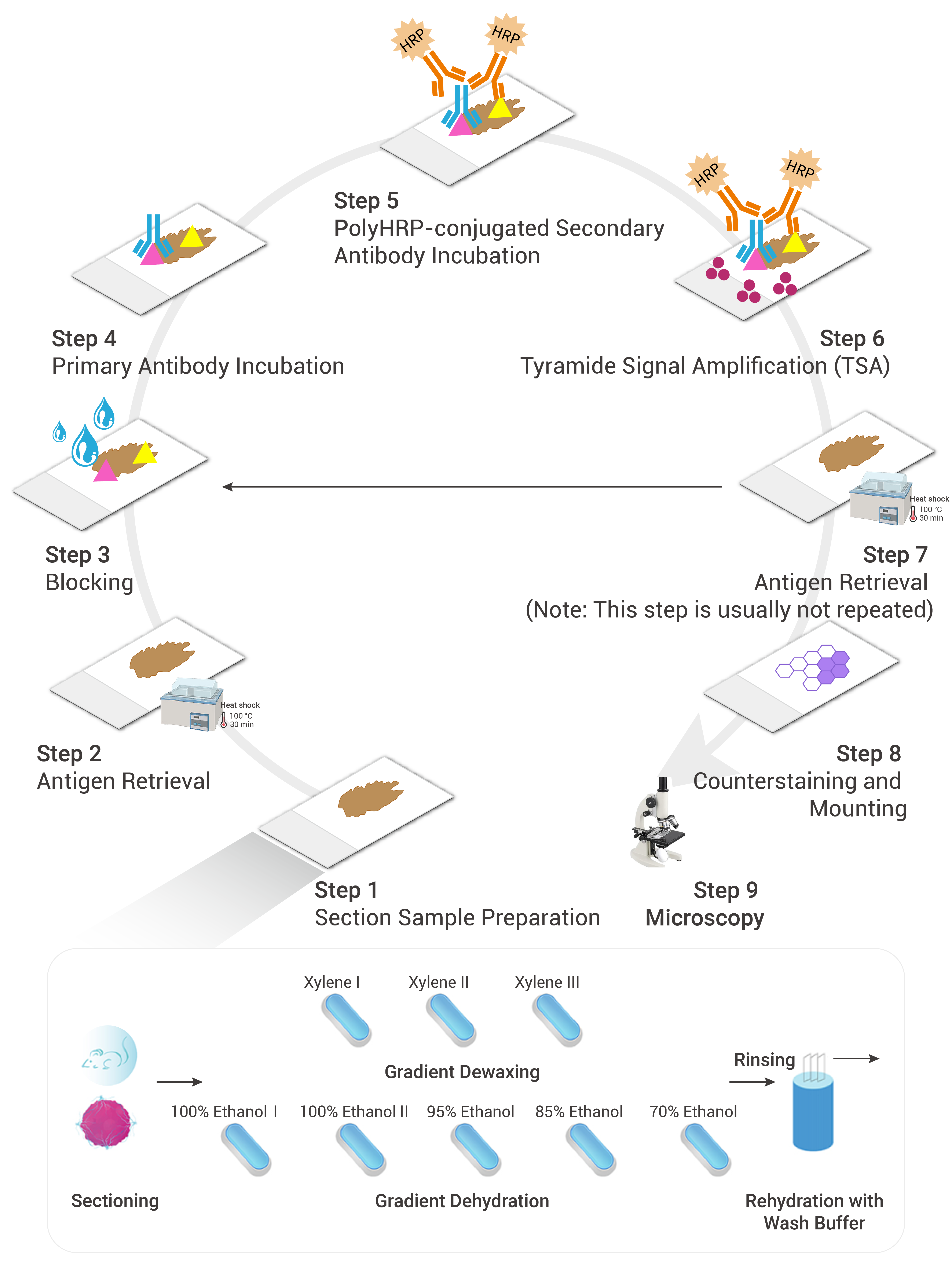 The process before the first antibody staining is called antigen retrieval. This is done to expose antigenic determinants blocked by paraffin or fixative, allowing the antibody to recognize the antigen. Antigen retrieval before subsequent rounds of antibody staining aims to remove antibodies from the previous round of staining as well as any unbound dye. For fresh, frozen sections, antigen retrieval is not necessary, but endogenous peroxidase blocking is still necessary. Frozen sections of fixed tissue still require antigen retrieval, but heating frozen sections can cause detachment, so we generally do not recommend switching fixed samples to frozen sections. Alternatively, frozen sections can be treated with antigen elution buffer.
