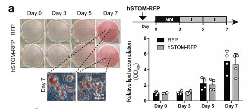 3T3-L1 cells were induced to differentiate after overexpressing Stomatin tagged with RFP (hSTOM-RFP), using RFP alone as the control. Lipid content in the resulting adipocyte-like cells was assessed by staining and semi-quantitative analysis.