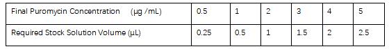 (2) Prepare a puromycin stock solution (1 mg/mL) and add to the cells in gradient concentrations as indicated in the reference table.
