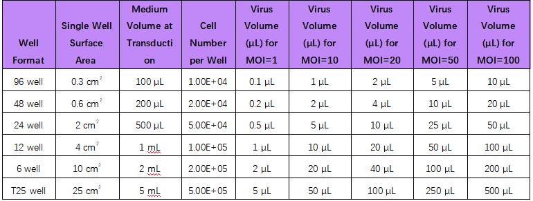 Table 3. Recommended Parameters for Cell Transduction (Viral Titer: 1E+8 TU/mL)