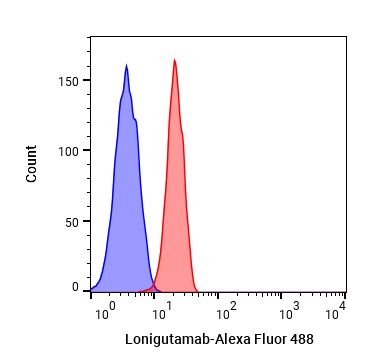 • Flow cytometric analysis of 1X106 MCF-7 cells with Lonigutamab (HY-P99712, red). Cells were fixed with 4% paraformaldehyde. Then stained with the primary antibody at 1/200 dilution for an hour at 4℃. Alexa Fluor 488-conjugated AffiniPure Goat Anti-Human IgG H&L (AF488) (HY-P83776) was used as the secondary antibody at 1/1,000 dilution for 30 minutes at 4℃. Human IgG1 kappa (HY-P99001, blue) was used as the isotype control.