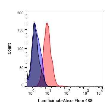 • Flow Cytometry analysis of Raji cells labelling FceR2/CD23 (red) with Lumiliximab (anti-FceR2/CD23) (HY-P99303). Goat Anti-Human IgG (Alexa Fluor 488) (HY-P83776) at a dilution of 1/1000 was used as the secondary antibody. Blue-Human IgG1 kappa (HY-P99001). Black-Unlabelled control, cells without incubation with primary antibody.