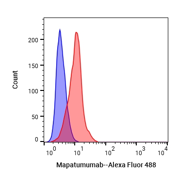 • Flow cytometric analysis of 1X106 A549 cells with Mapatumumab (HY-P99265, red). Cells were fixed with 4% paraformaldehyde. Then stained with the primary antibody at 1/200 dilution for an hour at 4℃. Alexa Fluor 488-conjugated AffiniPure Goat Anti-Human IgG H&L (AF488) (HY-P83776) was used as the secondary antibody at 1/1,000 dilution for 30 minutes at 4℃. Human IgG2 lambda (HY-P991206, blue) was used as the isotype control.