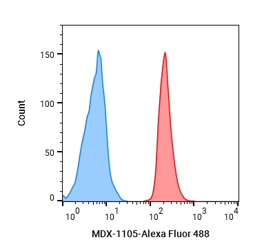 • Flow cytometric analysis of 1X106 500 ng/mL Ionomycin (HY-13434) and 20 ng/mL PMA (HY-18739) co-stimulated Jurkat cells(4h) labeling MDX-1105 (HY-P990623, red). Cells were fixed with 4% paraformaldehyde. Then stained with the primary antibody at 1/200 dilution for an hour at 4℃. Alexa Fluor 488-conjugated AffiniPure Goat Anti-Human IgG H&L (HY-P83776) was used as the secondary antibody at 1/1,000 dilution for 30 minutes at 4℃. Human IgG4 kappa Isotype Control (HY-P99003, blue) was used as the isotype control.