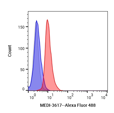 • Flow cytometric analysis of 1X106 TF-1 cells with MEDI-3617 (HY-P990625, red). Cells were fixed with 4% paraformaldehyde. Then stained with the primary antibody at 1/200 dilution for an hour at 4℃. Alexa Fluor 488-conjugated AffiniPure Goat Anti-Human IgG H&L (AF488) (HY-P83776) was used as the secondary antibody at 1/1,000 dilution for 30 minutes at 4℃. Human IgG2 kappa (HY-P99002, blue) was used as the isotype control, cells without incubation with primary antibody were used as the unlabeled control (black).