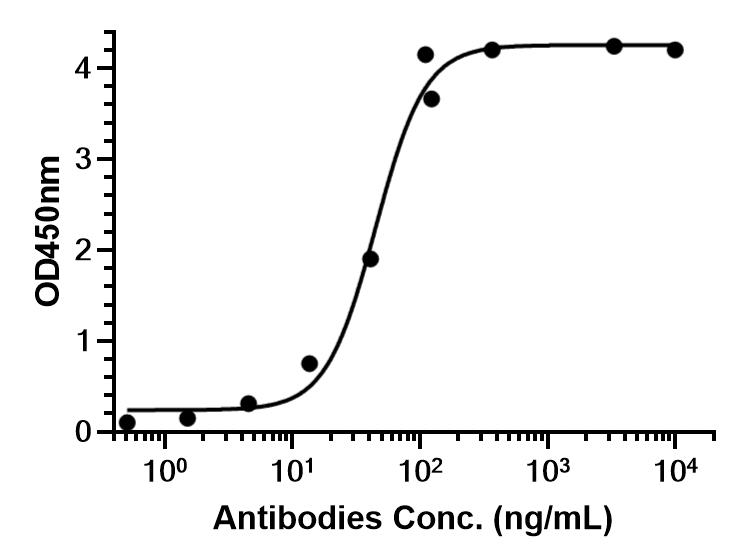 • Immobilized Human CCR4/CD194 Protein (VLP, Flag & His-Strep Tag) can bind Mogamulizumab. The EC50 for this effect is 46.52 ng/mL.