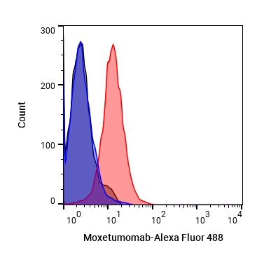 • Flow Cytometry analysis of Raji cells labelling Siglec-2/CD22 (red) with Moxetumomab (anti-Siglec-2/CD22) (HY-P99034). Goat Anti-Human IgG (Alexa Fluor 488) (HY-P83776) at a dilution of 1/1000 was used as the secondary antibody. Blue-Human IgG1 kappa (HY-P99001). Black-Unlabelled control, cells without incubation with primary antibody.