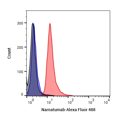 • Flow Cytometry analysis of A431 cells labelling MSPR/RON/CD136 (red) with Narnatumab (anti-MSPR/RON/CD136) (HY-P99375). Goat Anti-Human IgG (Alexa Fluor 488) (HY-P83776) at a dilution of 1/1000 was used as the secondary antibody. Blue-Human IgG1 kappa (HY-P99001). Black-Unlabelled control, cells without incubation with primary antibody.