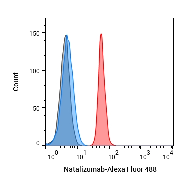 • Flow cytometric analysis of 1X106 Jurkat cells with Natalizumab (HY-108831, red). Cells were fixed with 4% paraformaldehyde. Then stained with the primary antibody at 1/200 dilution for an hour at 4℃. Alexa Fluor 488-conjugated AffiniPure Goat Anti-Human IgG H&L (HY-P83776) was used as the secondary antibody at 1/1,000 dilution for 30 minutes at 4℃. Human IgG4 (S228P) kappa Isotype Control (HY-P99003, blue) was used as the isotype control, cells without incubation with primary antibody were used as the unlabeled control (black).