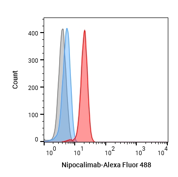 • Flow cytometric analysis of 1.5×106 THP-1 cells labeling Nipocalimab (HY-P99037, red). Cells were fixed with 4% paraformaldehyde and permeabilised with 90% methanol. Then stained with the primary antibody at 1/200 dilution for an hour at 4℃. Alexa Goat Anti-Human IgG H&L (AF488) (HY-P83776) was used as the secondary antibody at 1/1,000 dilution for 30 minutes at 4℃. Human IgG1 lambda Isotype Control (HY-P99992, blue) was used as the isotype control, cells without incubation with primary antibody were used as the unlabeled control (black).