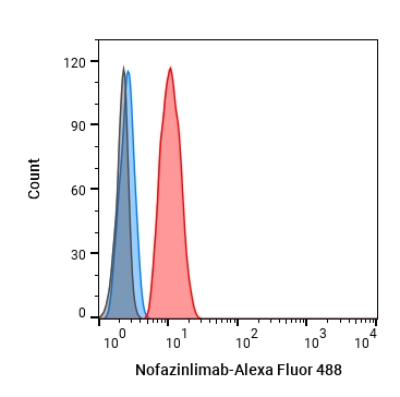 • Flow cytometric analysis of 1X106 10 ng/mL PMA and 1 μg/mL Ionomycin co-stimulated Jurkat cells(24h) labeling Nofazinlimab (HY-P99758, red). Cells were fixed with 4% paraformaldehyde. Then stained with the primary antibody at 1/200 dilution for an hour at 4℃. Alexa Fluor 488-conjugated AffiniPure Goat Anti-Human IgG H&L (HY-P83776) was used as the secondary antibody at 1/1,000 dilution for 30 minutes at 4℃. Human IgG4 kappa (HY-P99003, blue) was used as the isotype control, cells without incubation with primary antibody were used as the unlabeled control (black).