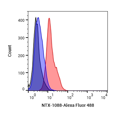 • Flow Cytometry analysis of U937 cells labelling PVR/CD155 (red) with NTX-1088 (anti-PVR/CD155) (HY-P990641). Goat Anti-Human IgG (Alexa Fluor 488) (HY-P83776) at a dilution of 1/1000 was used as the secondary antibody. Blue-Human IgG1 kappa (HY-P99001). Black-Unlabelled control, cells without incubation with primary antibody.