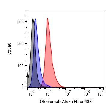 • Flow Cytometry analysis of A431 cells labelling NT5E/CD73 (red) with Oleclumab (anti-NT5E/CD73) (HY-P99039). Goat Anti-Human IgG (Alexa Fluor 488) (HY-P83776) at a dilution of 1/1000 was used as the secondary antibody. Blue-Human IgG1 lambda2 (HY-P990096). Black-Unlabelled control, cells without incubation with primary antibody.